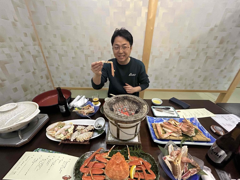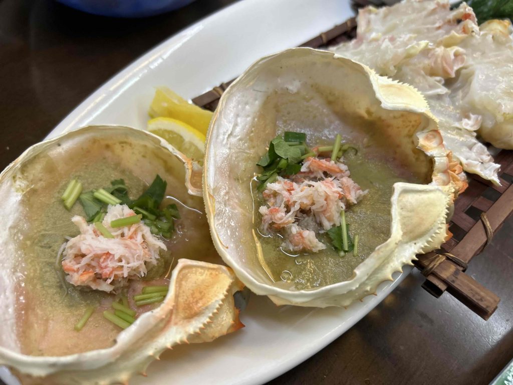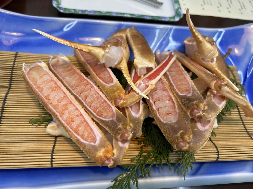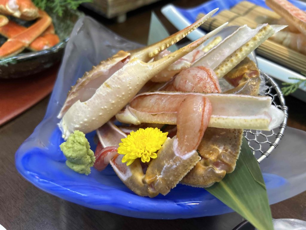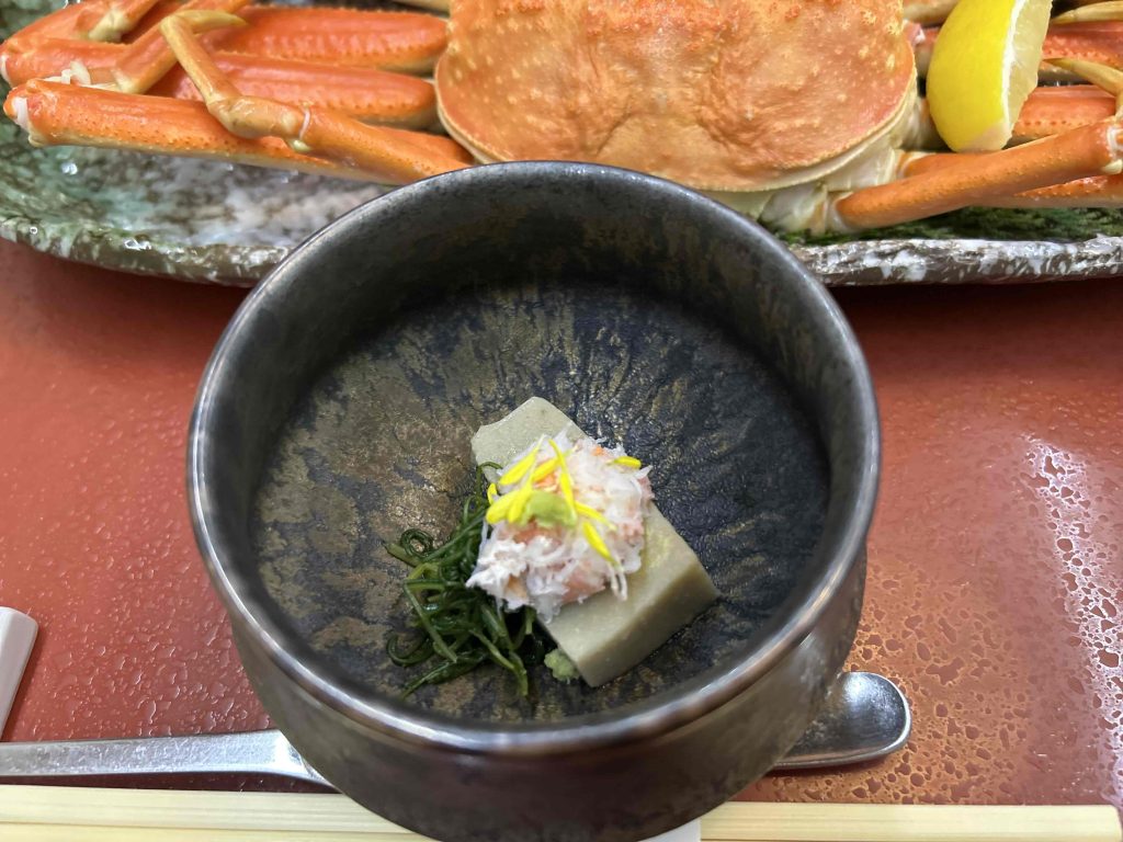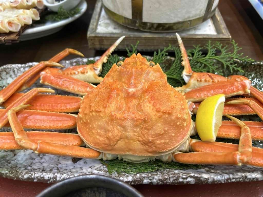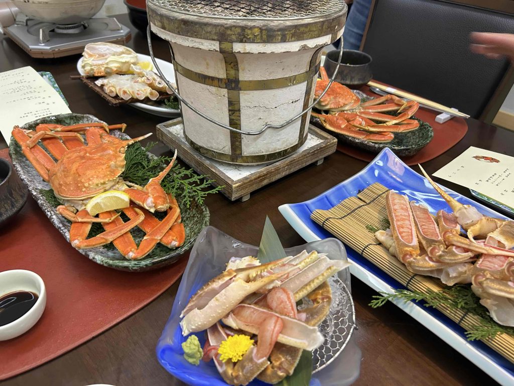今回はカニ三昧コースをいただきました。かに味噌豆腐、カニ刺し、ゆでカニ1杯、焼カニ、カニスキ、そして〆には雑炊🦀カニの全てを一度に堪能できるコースでした。日帰りプラン(入浴付)もあります♪